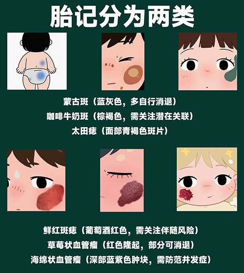 色素型胎记以褐色、黑色、青色为主;而血管型胎记则以红色、紫色为...